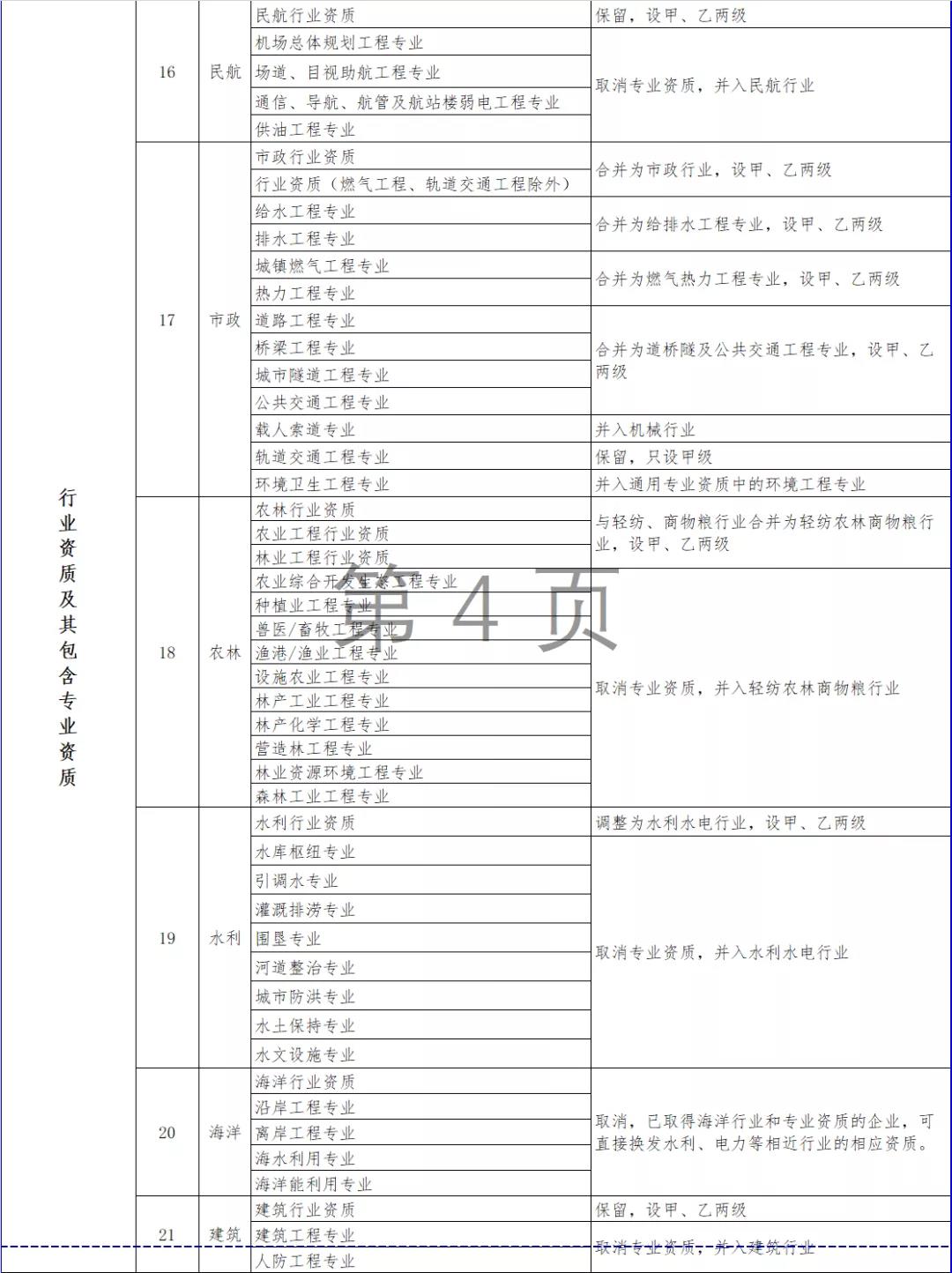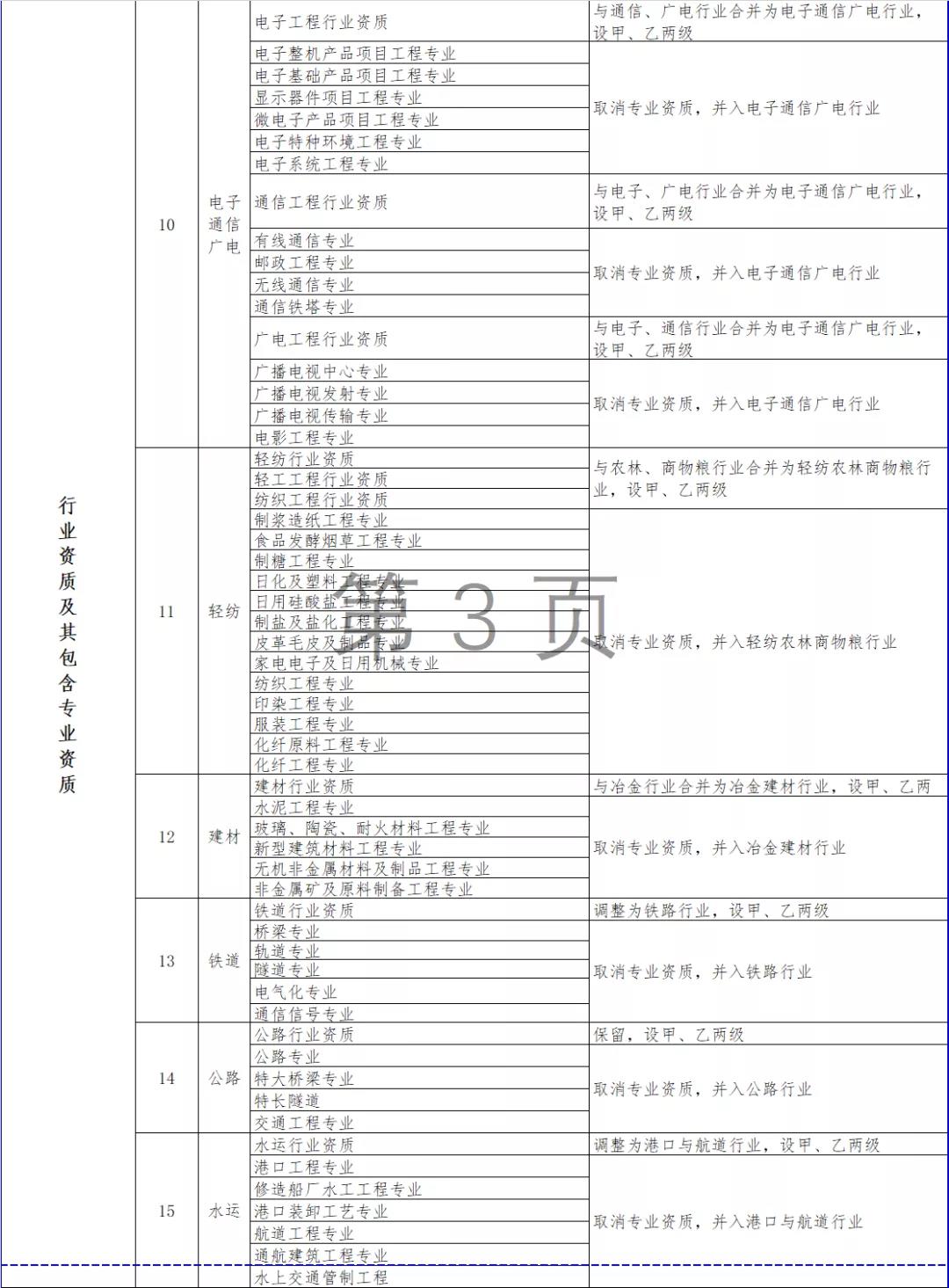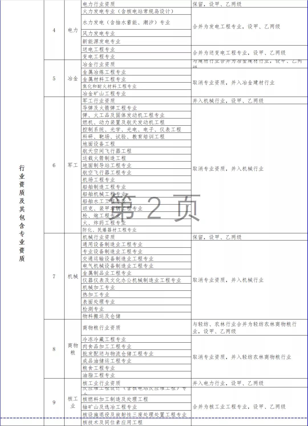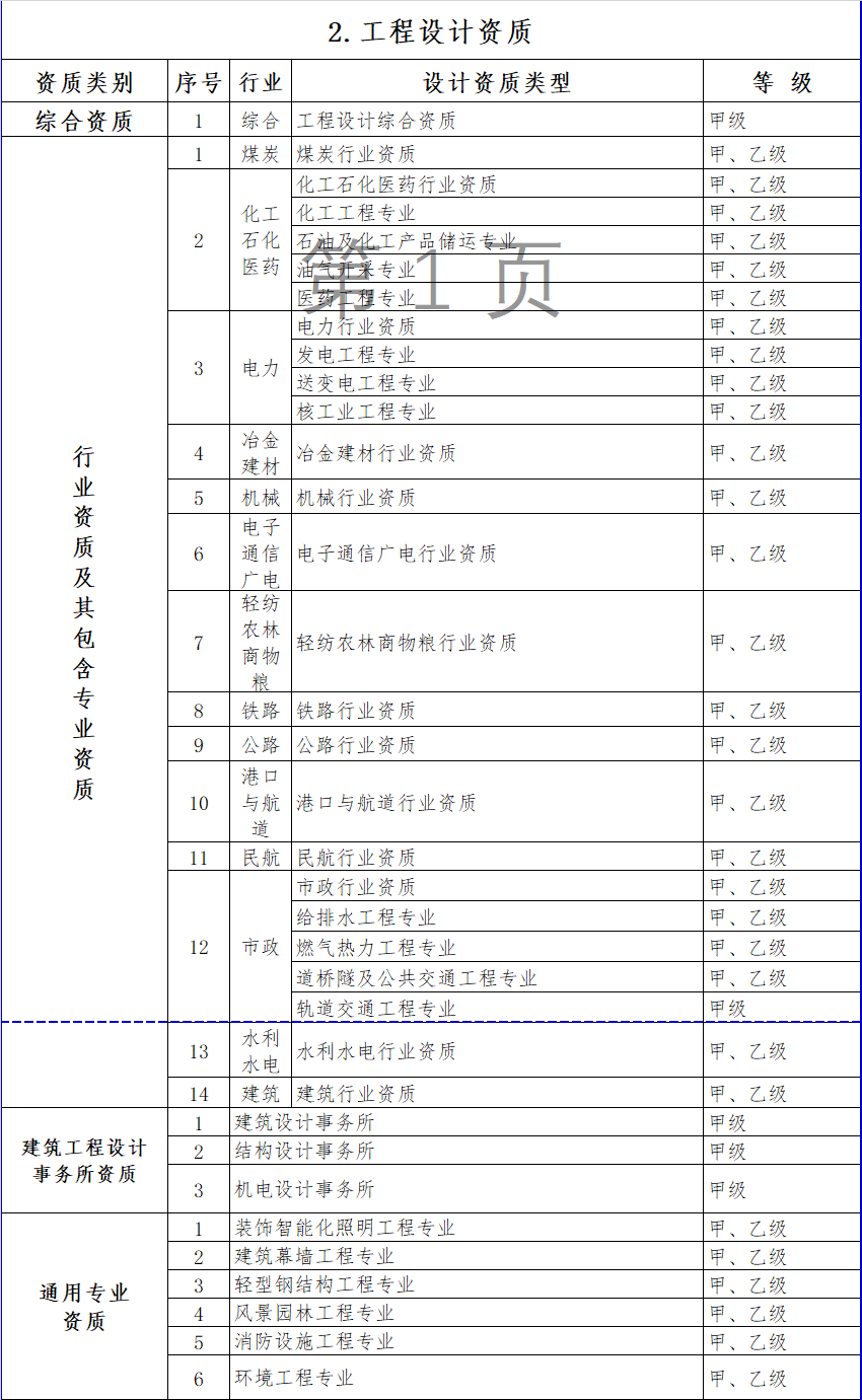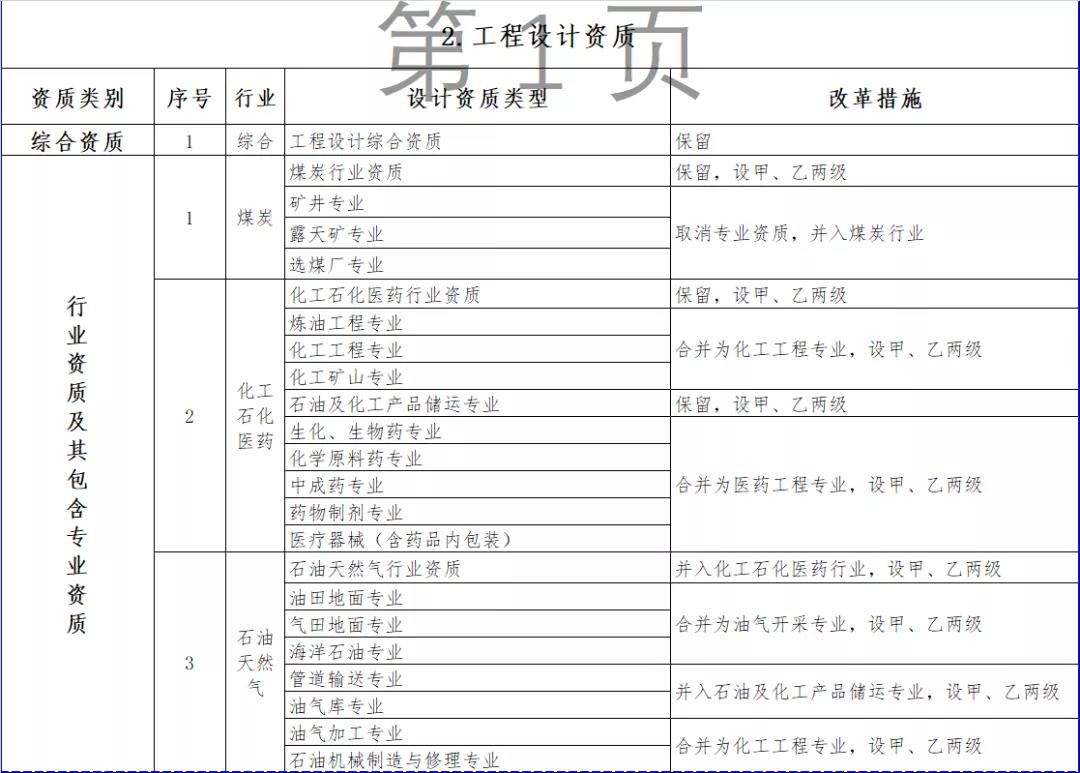 (二)工程設(shè)計(jì)資質(zhì)。保留綜合資質(zhì)。對部分行業(yè)資質(zhì)進(jìn)行整合,其中,冶金行業(yè)與建材行業(yè)合并為冶金建材行業(yè)資質(zhì),輕紡行業(yè)、農(nóng)林行業(yè)、商物糧行業(yè)合并為輕紡農(nóng)林商物糧行業(yè),電子行業(yè)、通信行業(yè)、廣電行業(yè)合并為電子通信廣電行業(yè),石油天然氣行業(yè)并入化工石化醫(yī)藥行業(yè),軍工行業(yè)并入機(jī)械行業(yè),核工業(yè)行業(yè)并入電力行業(yè),資質(zhì)等級壓減為甲、乙兩級,原丙級資質(zhì)并入相應(yīng)行業(yè)乙級資質(zhì)。取消海洋行業(yè)及專業(yè)資質(zhì),相關(guān)企業(yè)可以換發(fā)相近行業(yè)資質(zhì)。整合原化工石化醫(yī)藥、石油天然氣、電力、市政行業(yè)中的專業(yè)資質(zhì),資質(zhì)等級壓減為甲、乙兩級,原丙級資質(zhì)并入相應(yīng)專業(yè)乙級資質(zhì);取消其他行業(yè)的專業(yè)資質(zhì),并入相應(yīng)行業(yè)資質(zhì),原甲、乙級專業(yè)資質(zhì)并入相應(yīng)等級的行業(yè)資質(zhì),原丙級專業(yè)資質(zhì)并入乙級行業(yè)資質(zhì)。將專項(xiàng)資質(zhì)調(diào)整為通用專業(yè)資質(zhì),取消環(huán)境工程專項(xiàng)資質(zhì)的5個專項(xiàng)類別,整合為環(huán)境工程專業(yè)資質(zhì),資質(zhì)等級壓減為甲、乙兩級,原丙級資質(zhì)并入相應(yīng)專業(yè)乙級資質(zhì)。保留3類事務(wù)所資質(zhì)。