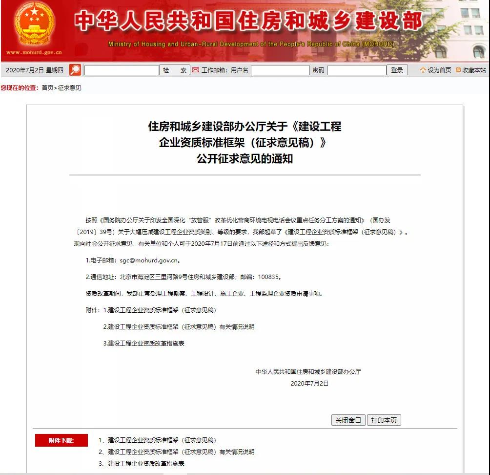 按照《國務(wù)院辦公廳關(guān)于印發(fā)全國深化“放管服”改革優(yōu)化營商環(huán)境電視電話會議重點(diǎn)任務(wù)分工方案的通知》(國辦發(fā)〔2019〕39號)關(guān)于大幅壓減建設(shè)工程企業(yè)資質(zhì)類別、等級的要求,我部起草了《建設(shè)工程企業(yè)資質(zhì)標(biāo)準(zhǔn)框架(征求意見稿)》?,F(xiàn)向社會公開征求意見,有關(guān)單位和個人可于2020年7月17日前通過以下途徑和方式提出反饋意見: